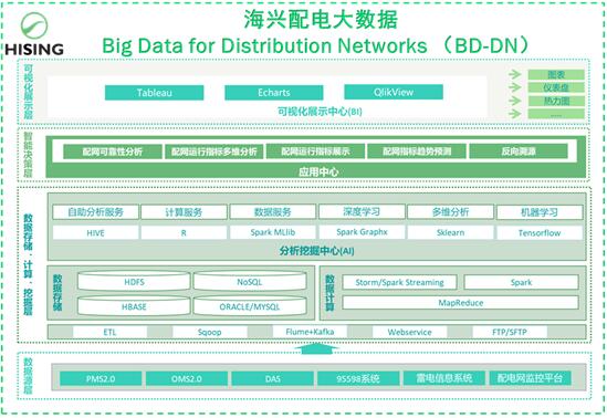 海興配電大數(shù)據(jù)BD-DN (Big Data for Distribution Networks) 通過與生產(chǎn)管理系統(tǒng)(PMS)、調(diào)度管理系統(tǒng)(OMS)、電力營銷95598系統(tǒng)、智能配電網(wǎng)運行監(jiān)控平臺、配電自動化系統(tǒng)等信息化系統(tǒng)的對接,自動獲取配網(wǎng)運行原始數(shù)據(jù),實現(xiàn)配網(wǎng)運行指標分析、可視化展示和價值挖掘。